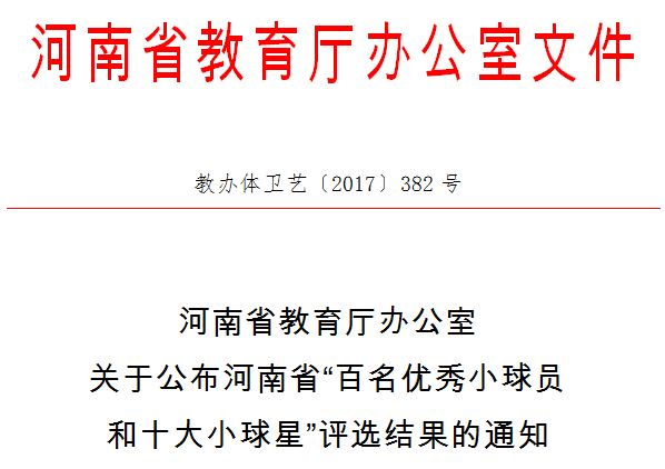 6月6日,河南省教育廳正式發(fā)文,向全省教育系統(tǒng)公布河南省首屆校園足球“百名優(yōu)秀小球員和十大小球星”的評選結(jié)果。